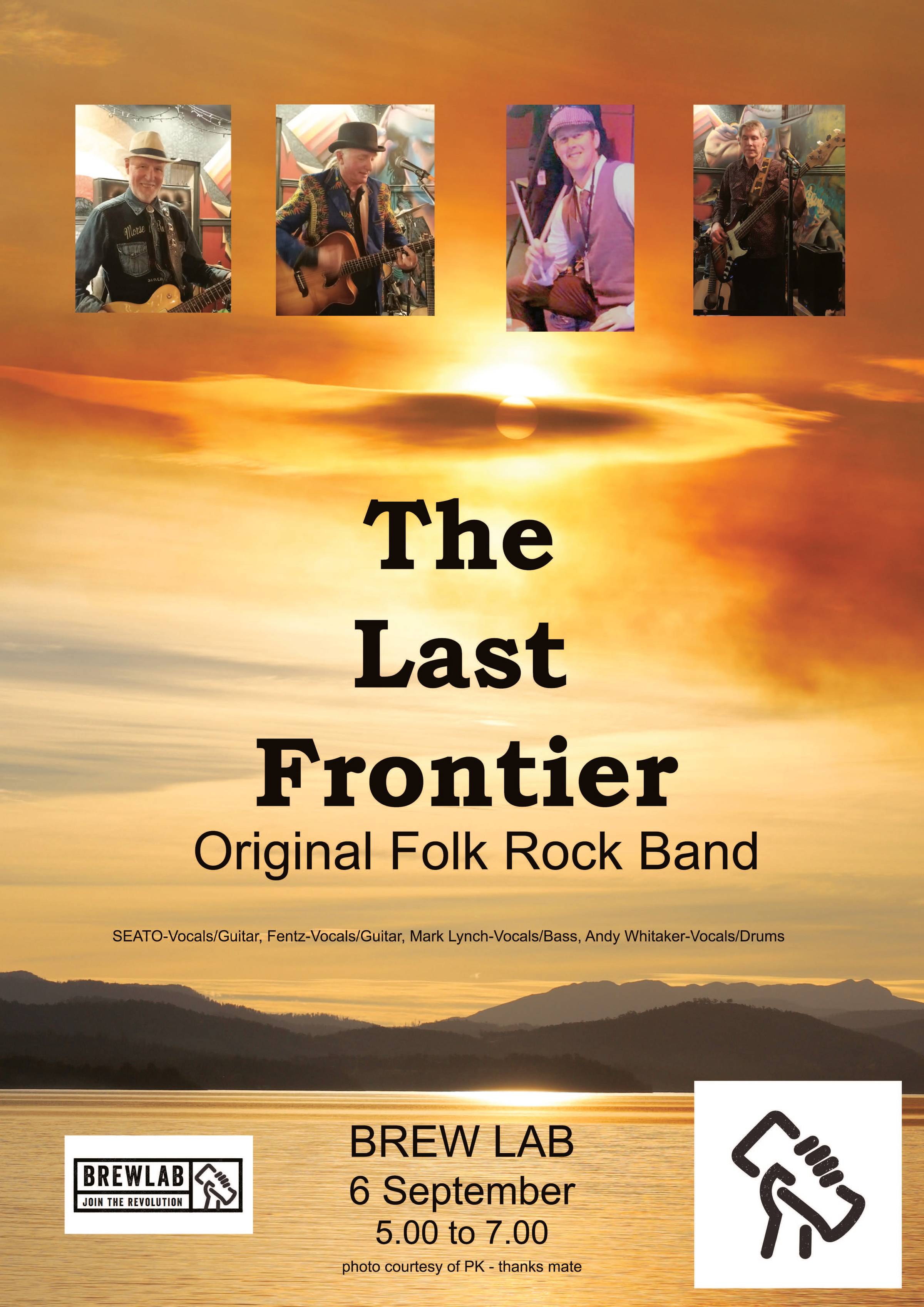 The Last Frontier is a 4-piece folk-rock band, born from the creative partnership of SEATO (guitar, vocals) and Fentz (lead guitar, vocals). Their original compositions were brought to life with the addition of Mark Lynch (bass, vocals) 18 months ago, and finally completed with the arrival of Andy Whittaker (drums, vocals) just 4 months back.